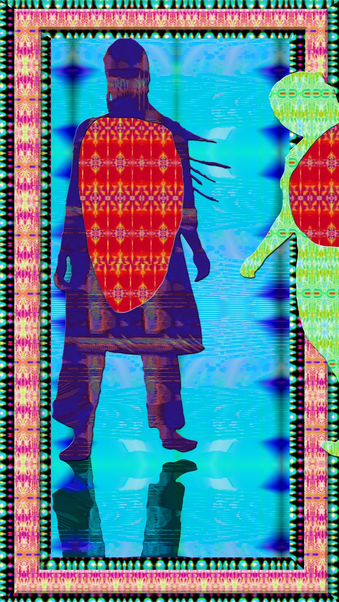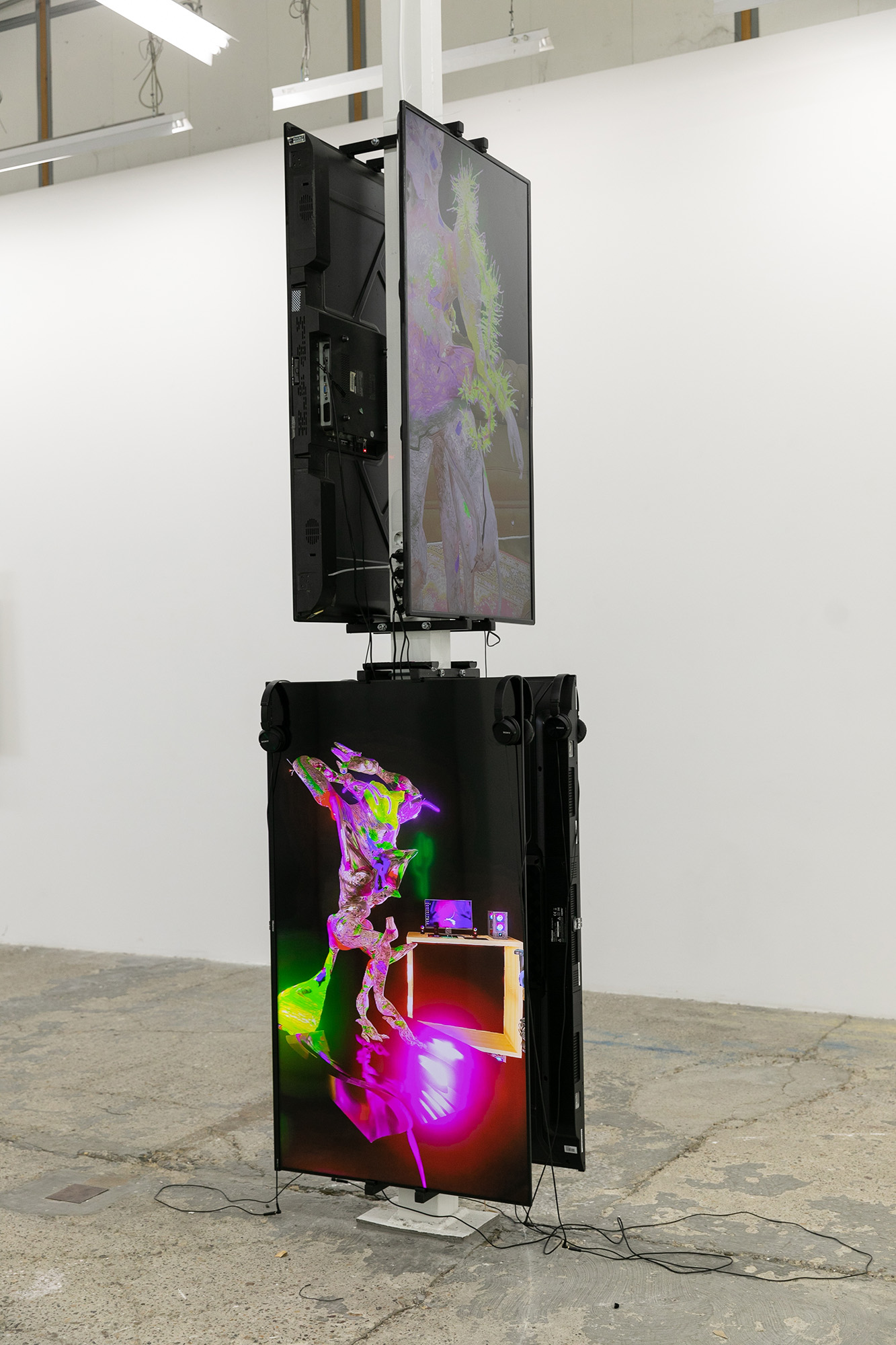 The 4-channel work is an immersive sound installation, which can be installed in a 4-channel pillar in which the viewer circulates around the work on 55-65" screens, or in a 4-channel circle surrounding the viewer on life-sized LED displays.