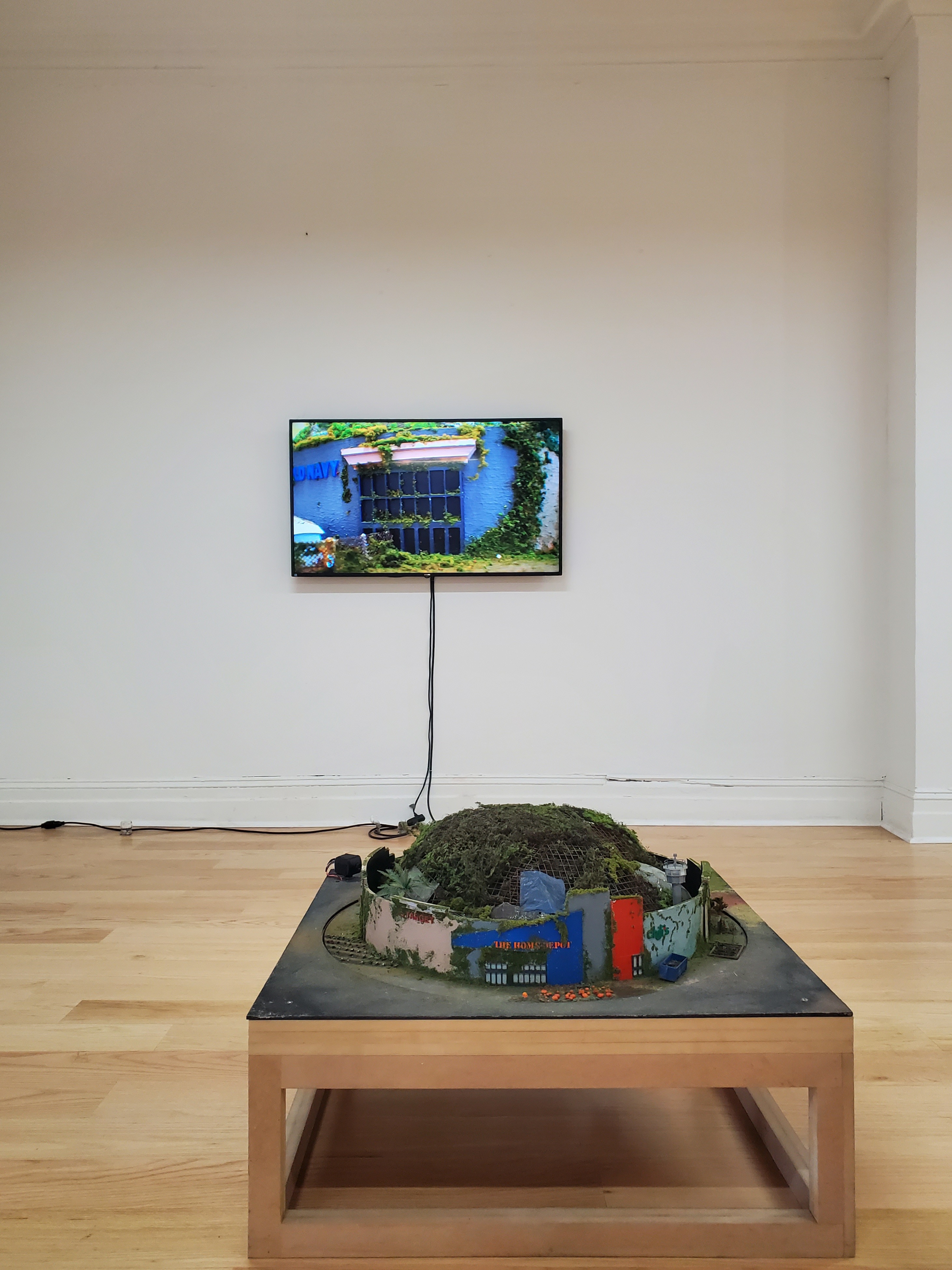 "In the two Big Box sculptures, models of an American-style big box shopping mall are placed on a slowly rotating turntable. The clean, nearly featureless mall building facades have been modified. In one reality, a trash-filled wasteland, and in another an over-grown jungle. In the wasteland, zombies have made advances. In the jungle,