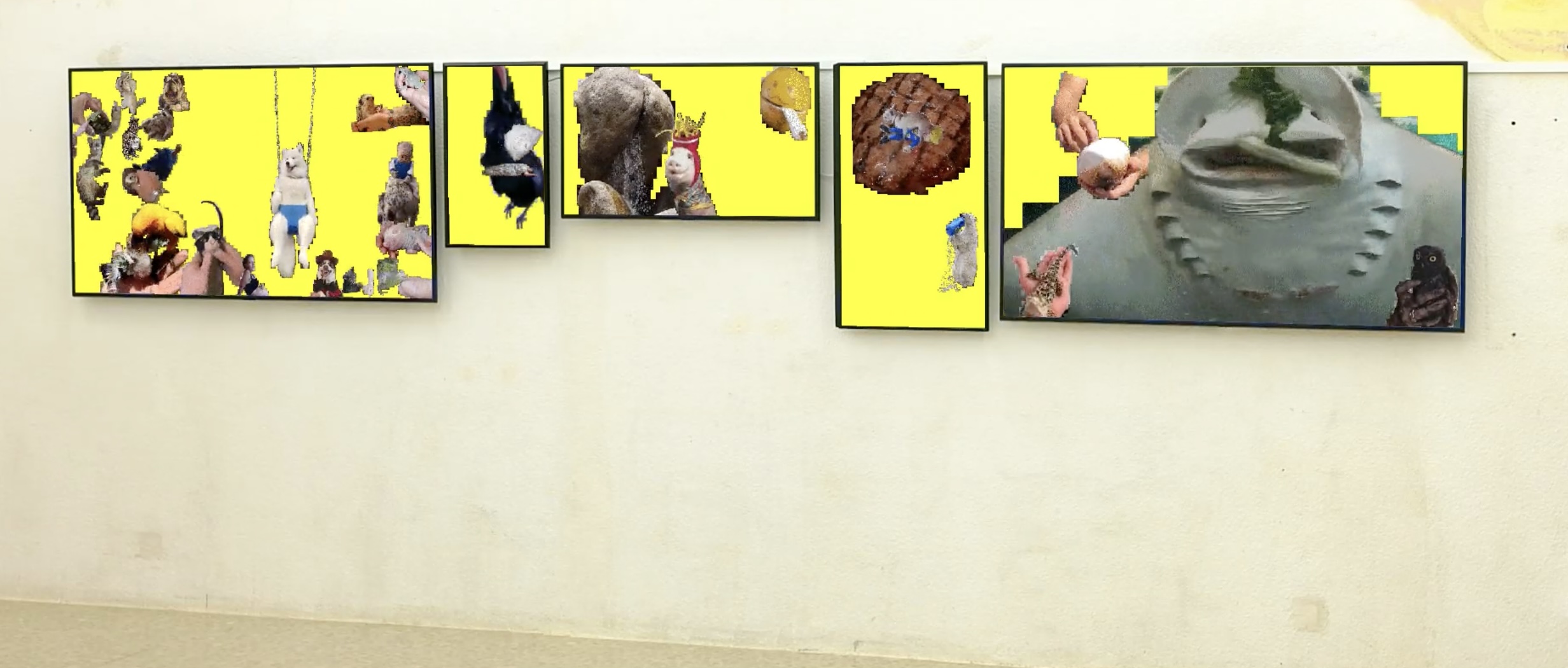 but also gives careful attention to mundane imagery we might not normally think twice about. This multi-channel collage work is characteristic of her GIF-based installations. It layers looping animations of found imagery like adorable animals in unusual situations, comfort foods, and bizarre characters until the collective effect turns intangible, anxious, and outrageous.